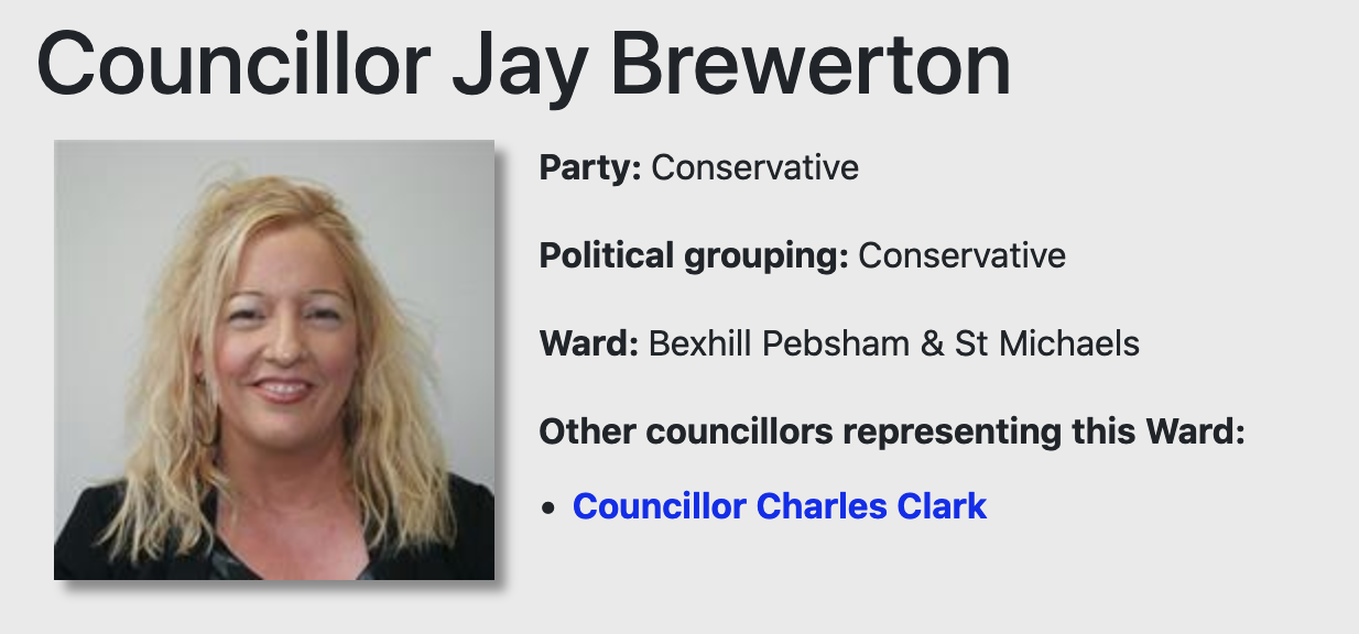 Also Voted onto Rother District Council by the electorate she canvassed as ‘Independent’. Source – https://rother.moderngov.co.uk/mgUserInfo.aspx?UID=121