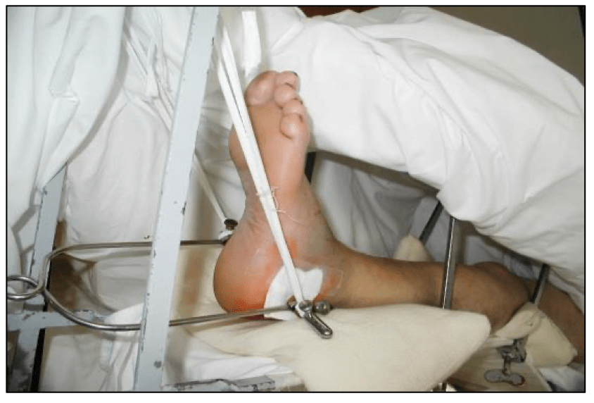 Thankfully asleep for the drilling/insertion – “a steel pin that had been driven through my ankle and was protruding perhaps a couple of inches each side”Skeletal Traction
