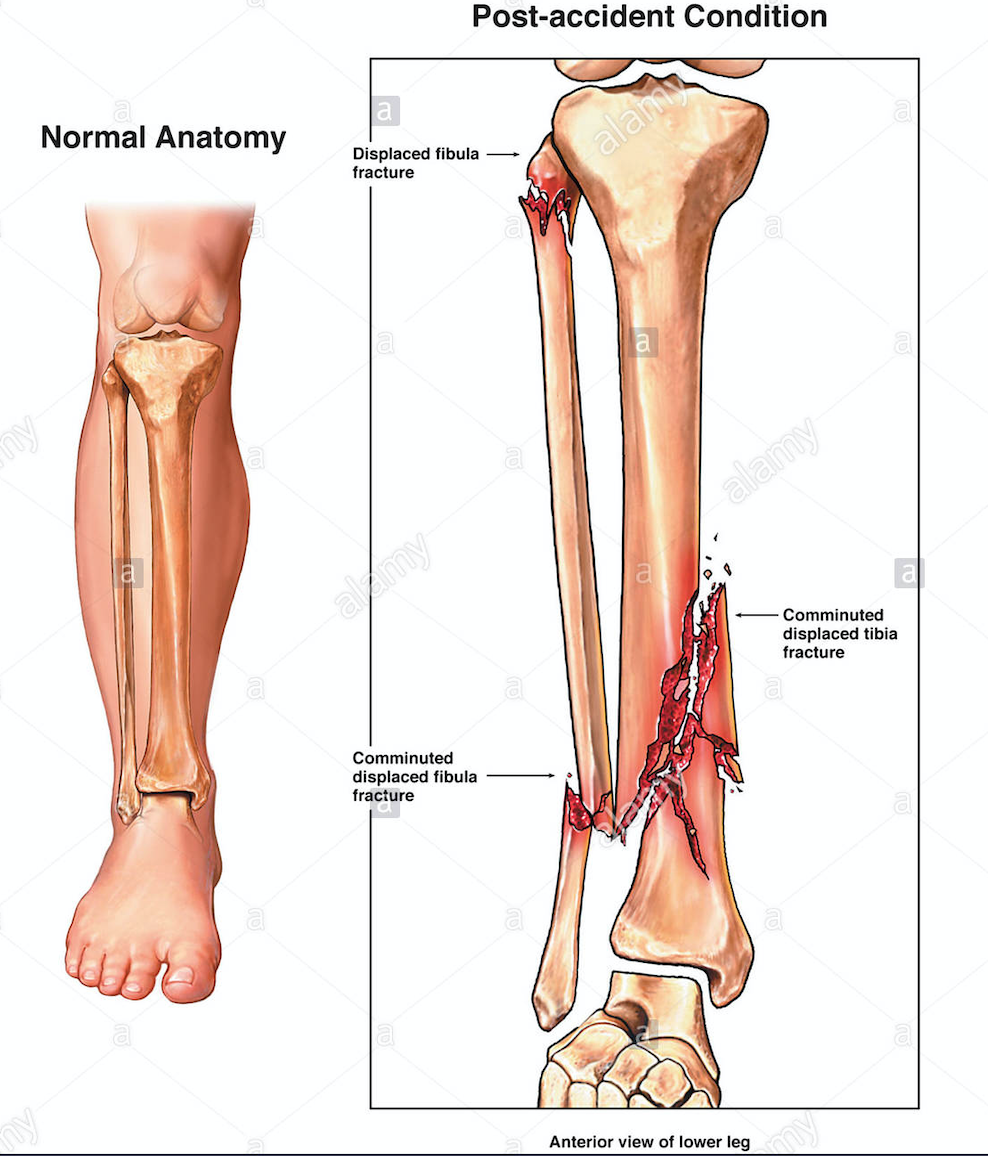 The image below shows a comminuted fracture (basically shattered into many pieces) My own injuries were complicated by being ‘Open Comminuted’ where the shattered bones were exposed having been forced out through the flesh and muscle. Many months later I would require further major surgery for ‘Bone Grafting’ (Basically replacing the missing pieces with bone removed from my pelvis) … this was due to ‘delayed union’ and in my case ‘non union’ due to all the soft tissue damage which compromised blood supply to the bone.